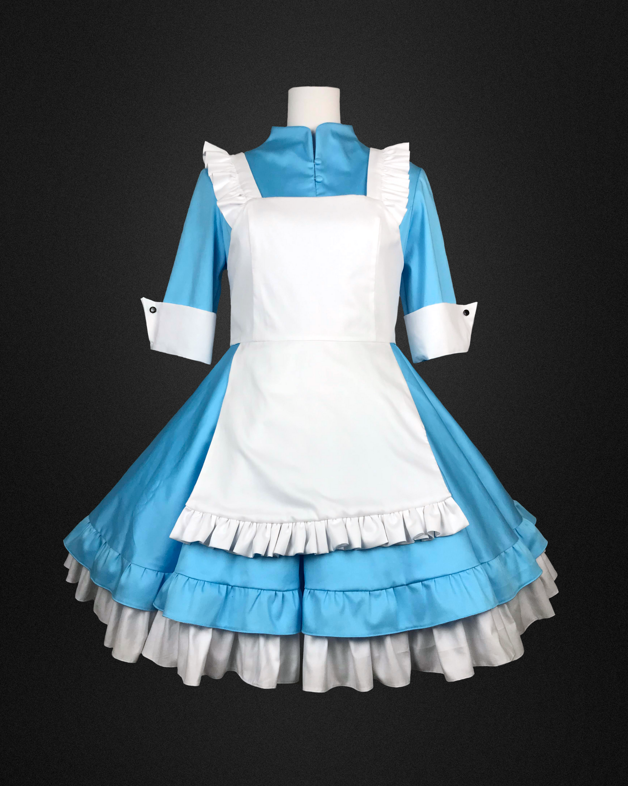 Examples: An idol costume with a fitted bodice, skirt with ruffle trim, matching hair accessory and wrist cuffs. A maid costume with a dress, apron with ruffles, tiered petticoat, and headband.